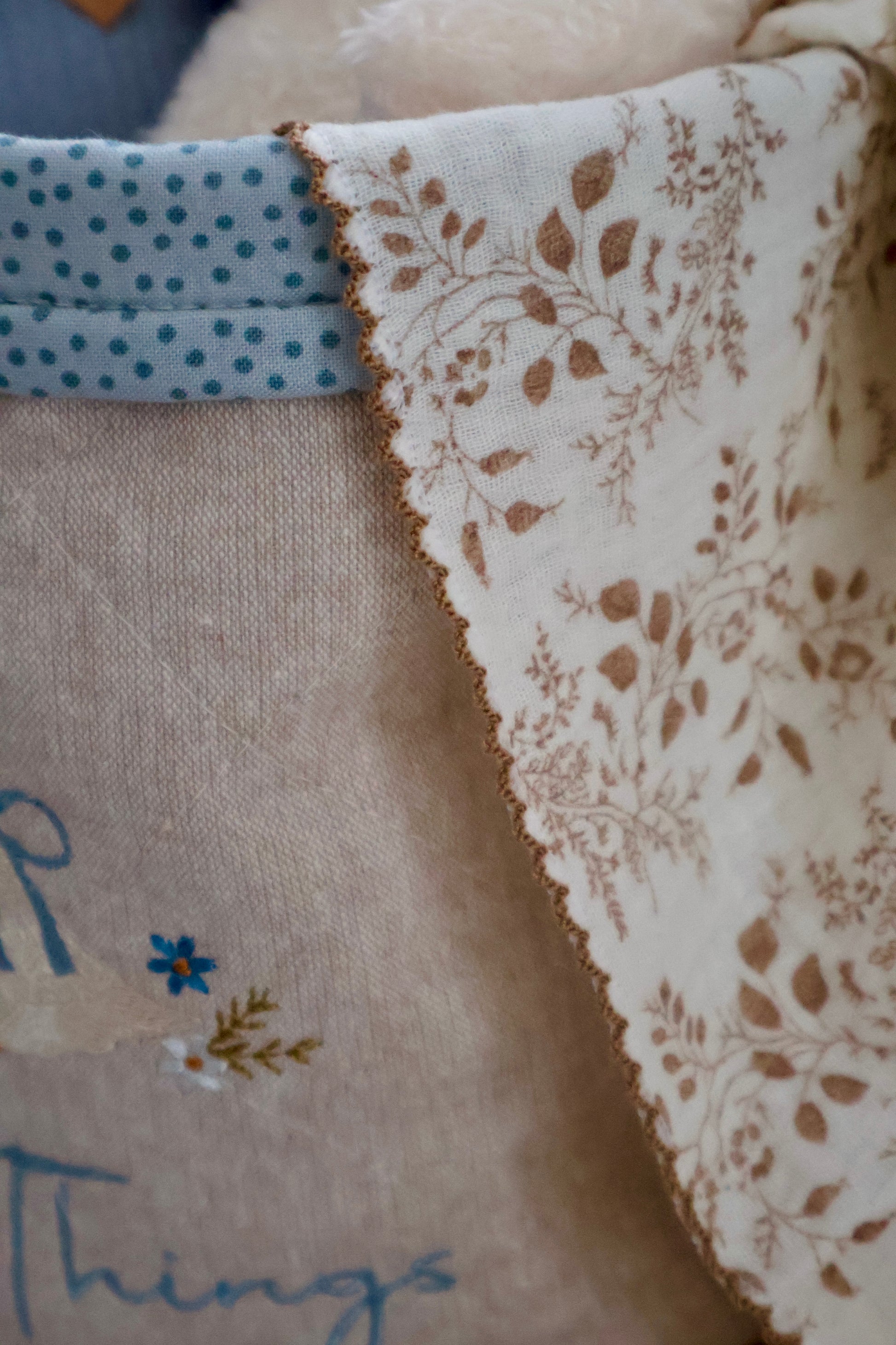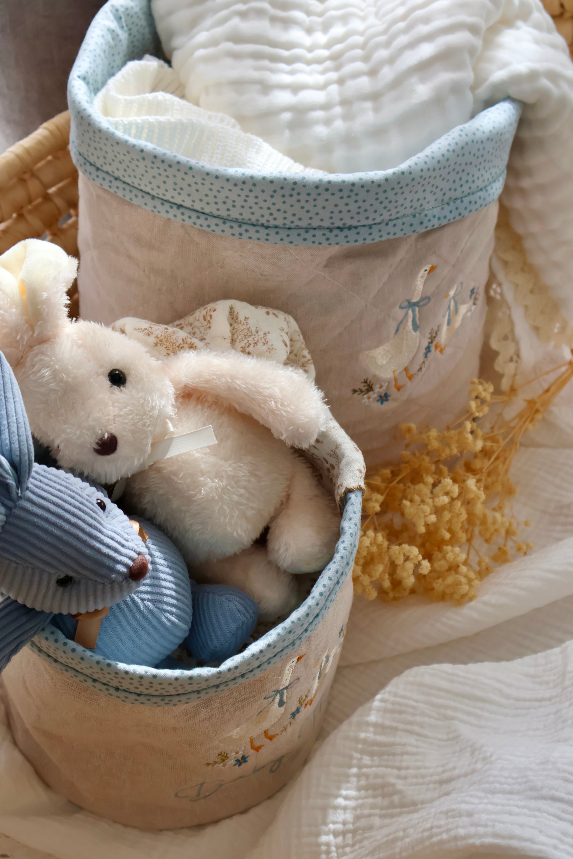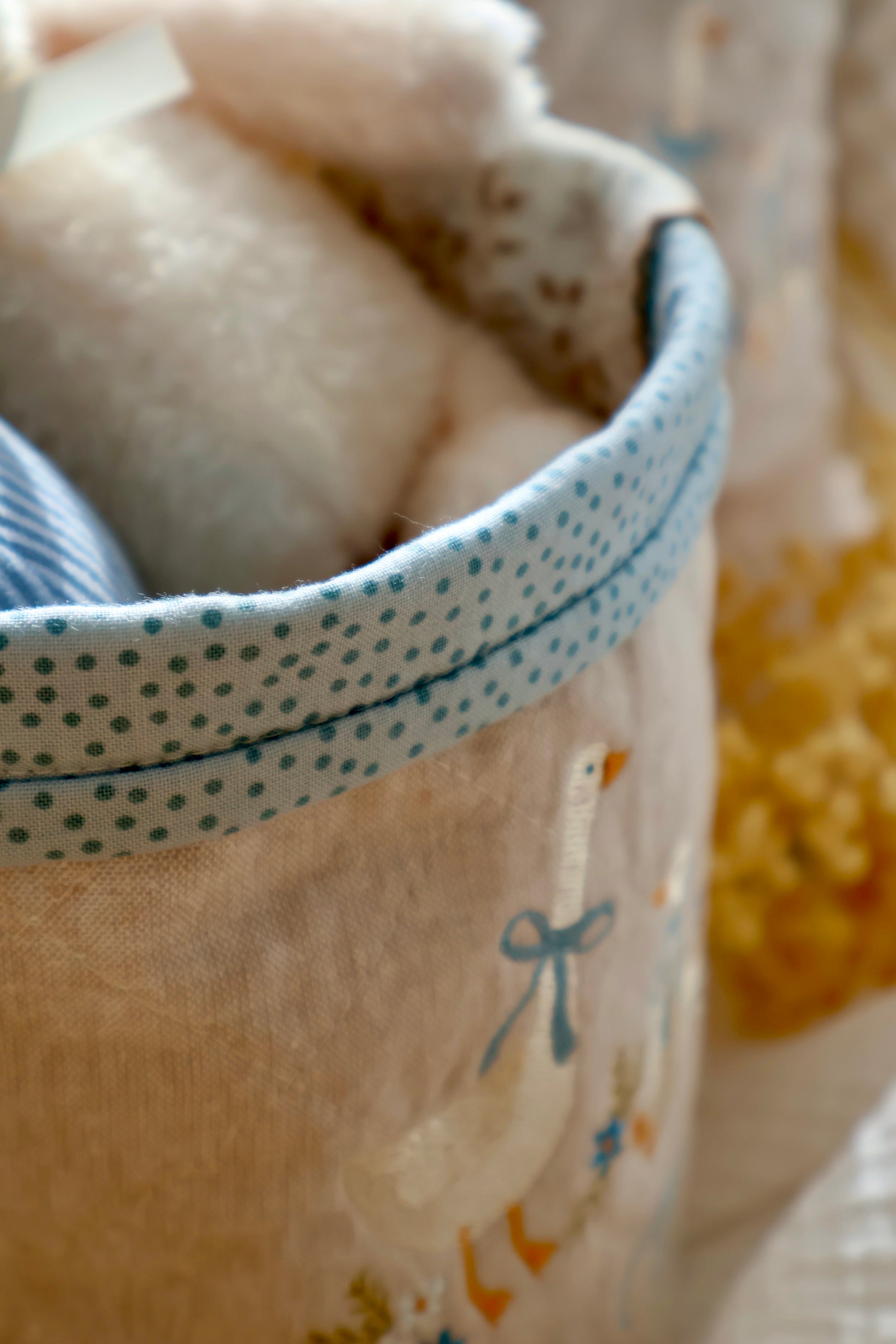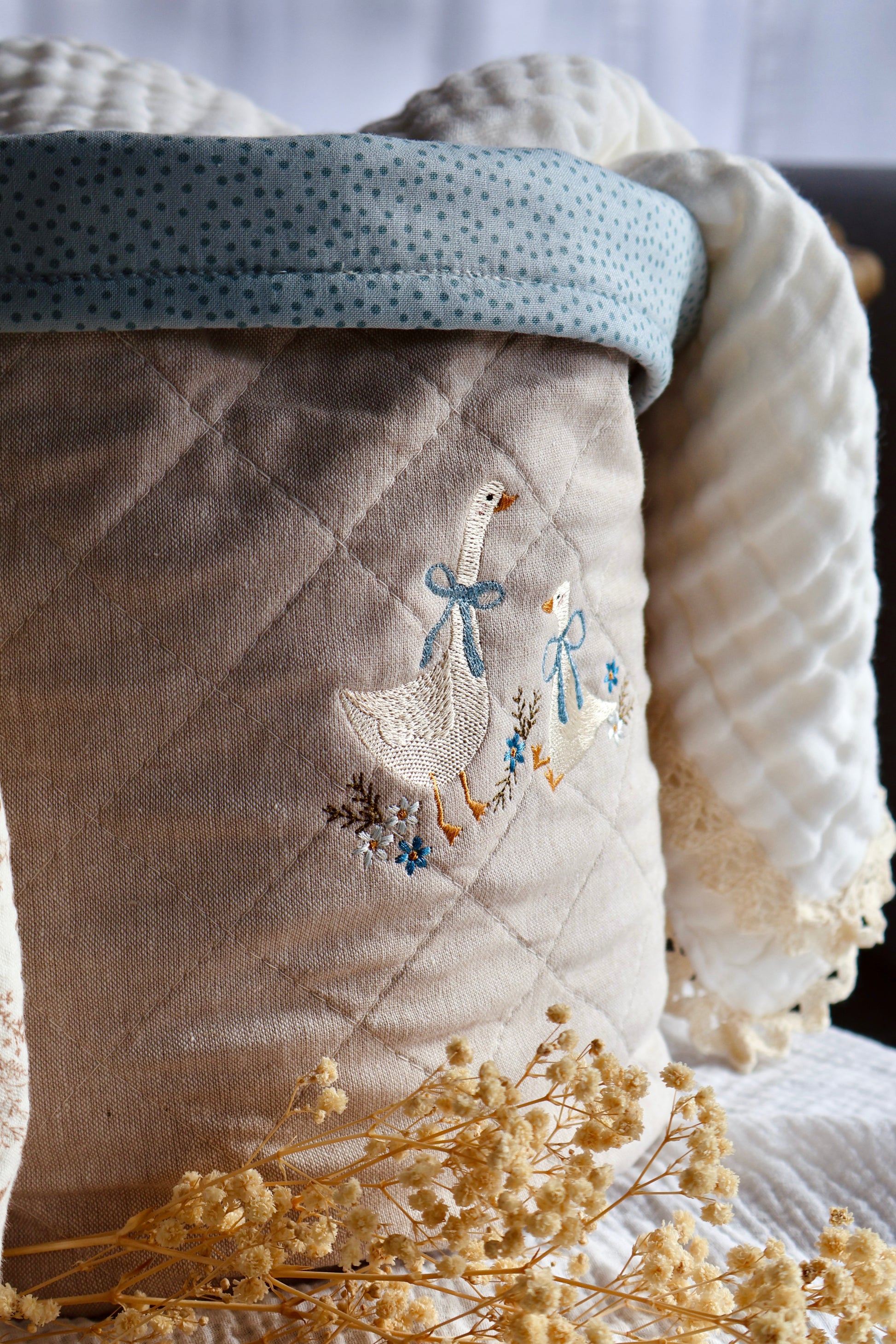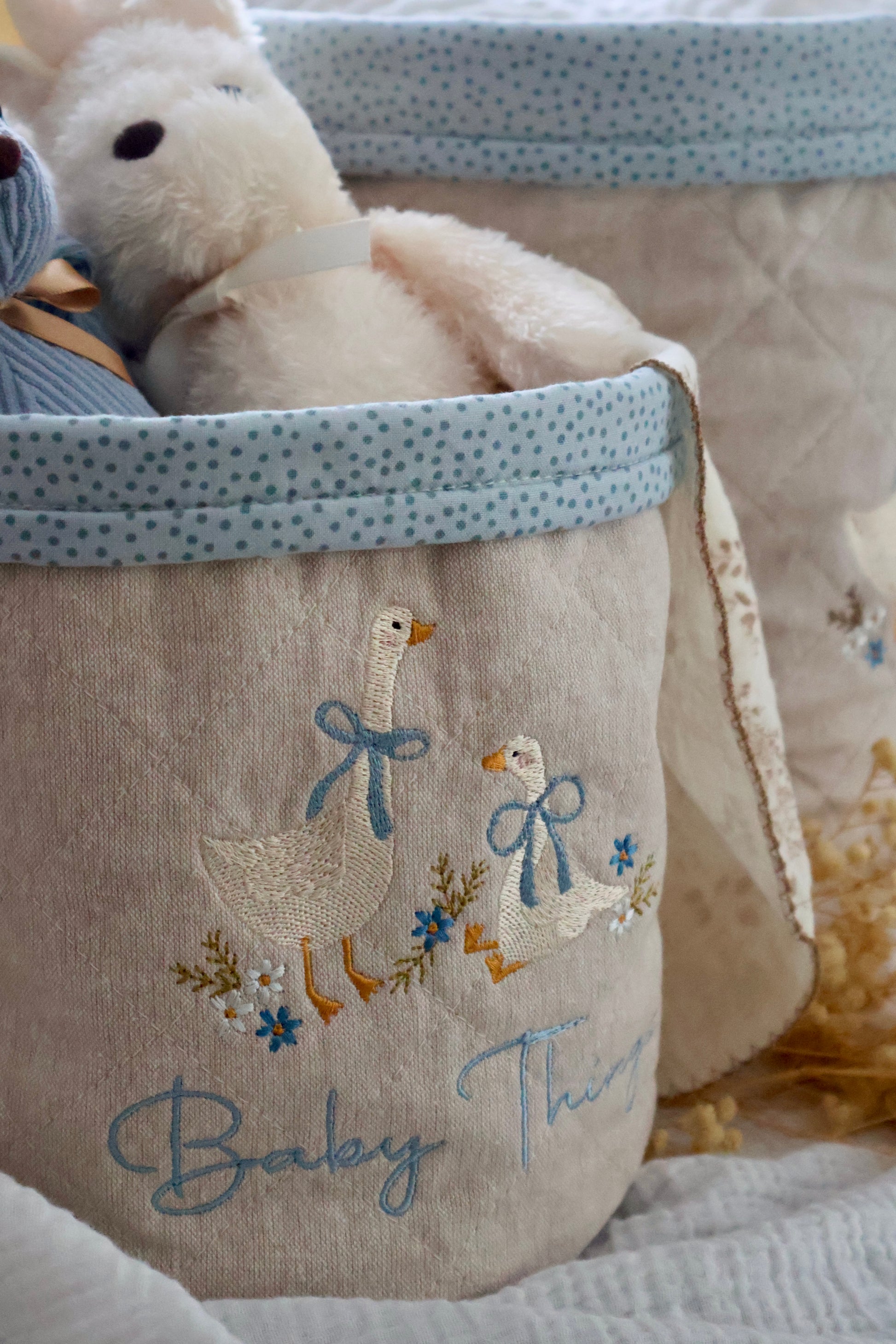 The front features a hand-drawn embroidery design of two whimsical geese, stitched in soft blue, ivory, and golden tones with delicate floral details. A blue polka dot trim adds a sweet finishing touch, making this basket both decorative and functional.